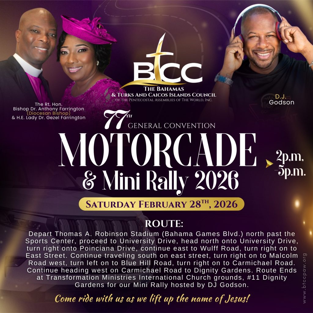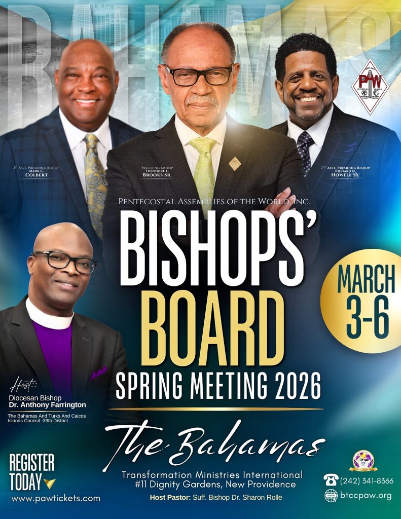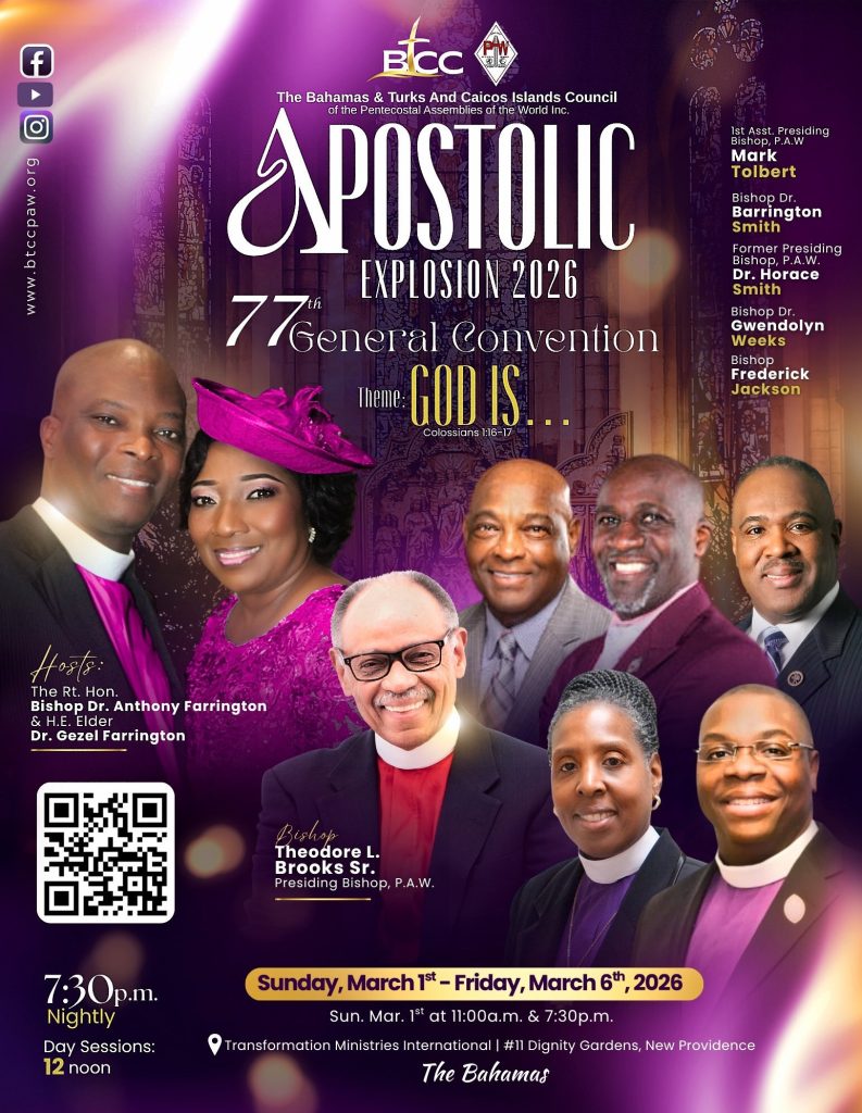 The Bahamas & Turks & Caicos Council 39th District ***APOSTLE EXPLOSION-77th General Convention 2026 (March 1st-6th) will host *The Pentecostal Assemblies of the World, Inc. BISHOPS BOARD Spring Meeting at Transformation Ministries International #11 Dignity Gardens in New Providence, Bahamas.